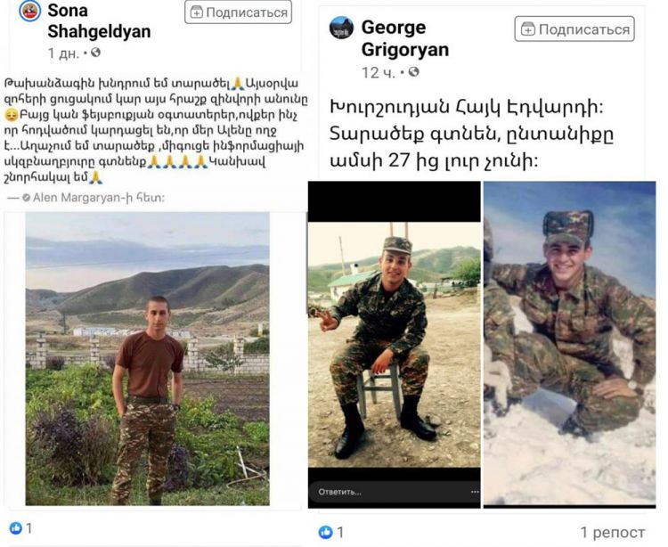 Ermənistan Müdafiə Nazirliyinin nümayəndəsi Artsrun Ovannisyan sosial şəbəkələrdə hərbçilərin taleyi ilə bağlı paylaşımların çox olduğunu etiraf edir. Ovannisyan etiraf edib ki, bəzi vətəndaşlar bu günlərdə oğullarının fotolarını sosial mediada dərc edərək onların tapılmasına kömək istəyir: "Münaqişə bölgəsində şiddətli döyüşlər davam edir. Bu da öz növbəsində həlak olanların cəsədlərinin tapılmasını çətinləşdirir. Bu savaş tamamilə fərqlidir, ilk müharibədən və 2016-cı ilin Aprel döyüşlərindən fərqli olaraq bir kabusdur. Üzr istəyirik və buna anlayışla yanaşmağınızı xahiş edirik”.