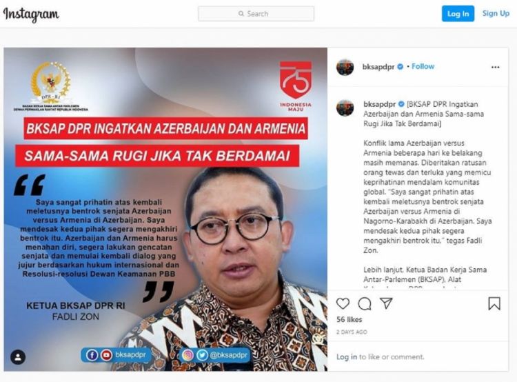 İndoneziya parlamentinin Nümayəndələr Palatasının Parlamentlərarası əməkdaşlıq komitəsi Ermənistan ordusunun Azərbaycan ərazisindən dərhal, qeyd-şərtsiz və tamamilə çıxarılmasını tələb edən bəyanat yayıb.