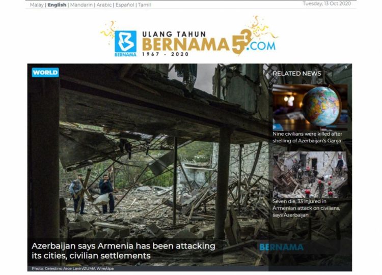 Malayziyanın BERNAMA dövlət informasiya agentliyi Ermənistan silahlı qüvvələrinin Gəncə şəhərində mülki əhaliyə və obyektlərə raket zərbələri endirməsinə dair növbəti məqalə dərc edib.