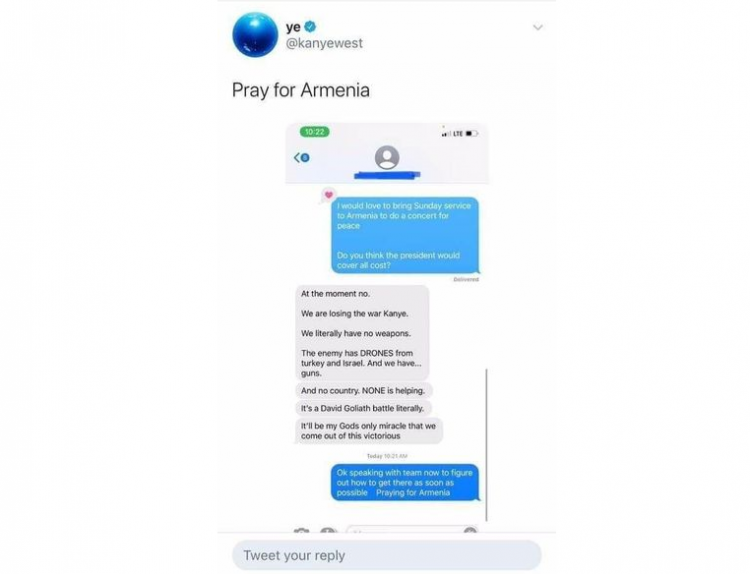 NUHÇIXAN İnformasiya Agentliyi xəbər verir ki, Repçi Kanye Vest "Twitter" hesabında adı gizlədilmiş erməni ilə yazışmasını paylaşıb.