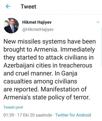 O bildirib ki, Ermənistana yeni raket sistemləri gətirildi. Bundan dərhal sonra onlar Azərbaycan şəhərlərindəki mülki insanlara xain və qəddarcasına hücum etməyə başladılar. Gəncədə mülki şəxslər arasında itkilərin olduğu bildirilir. Ermənistan dövləti terror siyasətinin təzahürüdür.