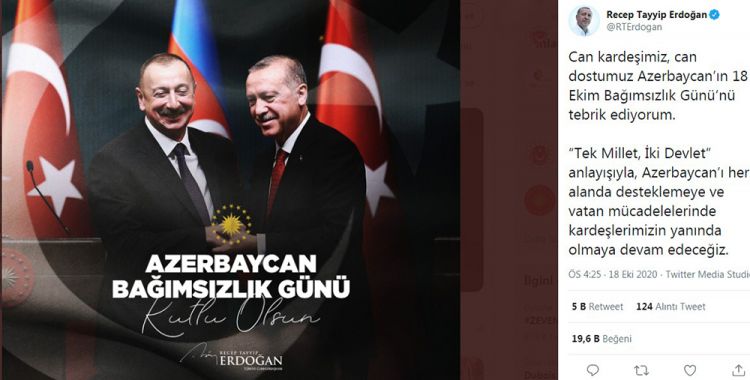 Bu gün Türkiyə Respublikasının Prezidenti Rəcəb Tayyib Ərdoğan özünün rəsmi “Twitter” səhifəsində 18 oktyabr - Azərbaycanın Müstəqilliyi Günü münasibətilə təbriklərini çatdırıb.