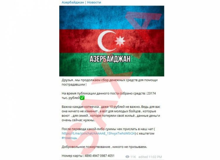 Nəqliyyat, Rabitə və Yüksək Texnologiyalar Nazirliyindən NUHÇIXAN İnformasiya Agentliyinə bildirilib ki, Ermənistan tərəfi isə vəziyyətdən sui-istifadə edərək, “Telegram” və digər sosial şəbəkələrdə Azərbaycan adından saxta səhifələr yaradaraq müharibə qurbanlarına və əsgərlərimizə yardım adı altında vəsait toplayır.