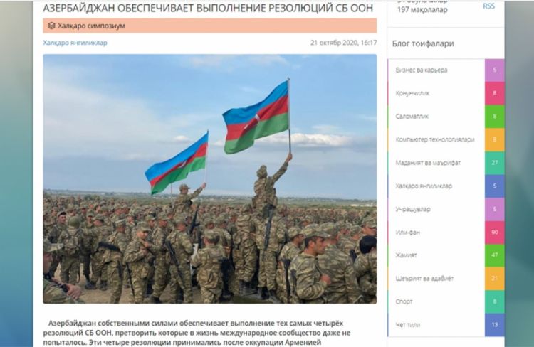 “fikr.uz” və “tarjumon.uz” portalları bildirir ki, BMT Təhlükəsizlik Şurası Ermənistan silahlı qüvvələrinin Azərbaycan ərazilərindən qeyd-şərtsiz çıxarılması ilə bağlı 4 qətnamə qəbul edib. Otuz il ərzində Təhlükəsizlik Şurasının etmədiyi işi bu gün Azərbaycan Ordusu edir, işğal altında olan torpaqlar azad olunur. Artıq Cəbrayıl, Füzuli və Zəngilan şəhərlərində, həmçinin 90-dan çox kənddə Azərbaycan bayrağı dalğalanır.