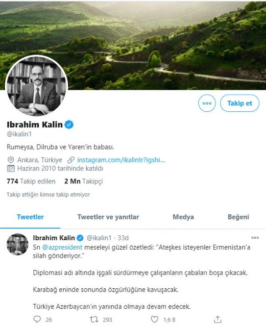 NUHÇIXAN İnformasiya Agentliyi xəbər verir ki, bu sözləri Türkiyə Prezidentinin müşaviri İbrahim Kalın “Twitter” hesabında yazıb.