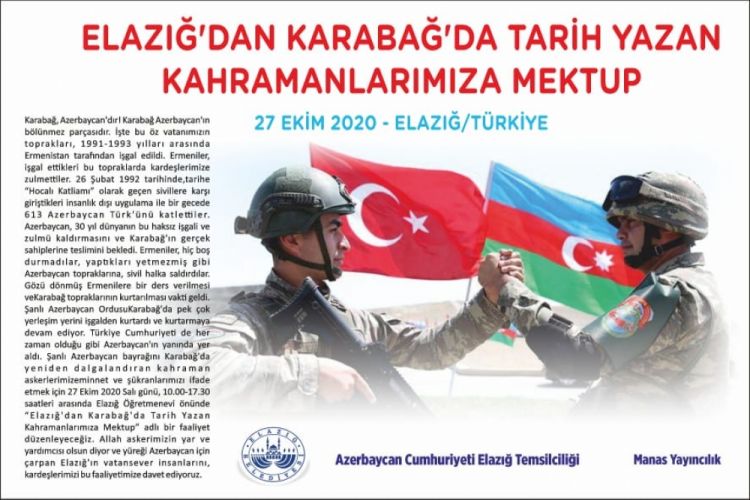 NUHÇIXAN İnformasiya Agentliyi xəbər verir ki, oktyabrın 27-də Elazığ Müəllimlər Evinin qarşısındakı meydanda “Elazığdan Qarabağda dastan yazan qəhrəmanlarımıza məktub” aksiyasına start veriləcək. Türkiyəli qardaşlarımız, eləcə də bu ölkədə təhsil alan və çalışan soydaşlarımız səmimi ürək sözləri ilə Müzəffər Ordumuzun sıralarını şərəfləndirən qəhrəman igidlərə mənəvi dəstəklərini ifadə edəcəklər.
