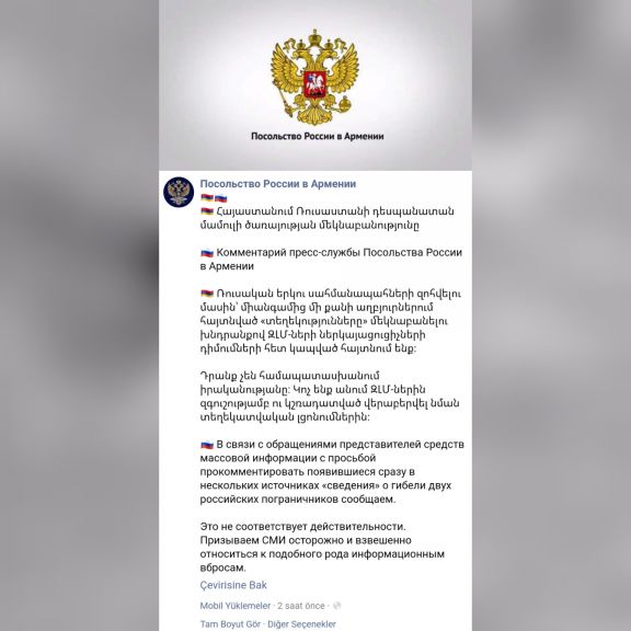 Rusiya Federasiyasının Yerevandakı səfirliyi Azərbaycan Silahlı Qüvvələrinin zərbələri nəticəsində guya Rusiya sərhədçilərinin həlak olması haqqında şayiələri təkzib edib.