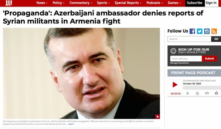 NUHÇIXAN İnformasiya Agentliyi xəbər verir ki, ABŞ-ın “Washington Times” qəzetinə müsahibəsində Azərbaycanın bu ölkədəki səfiri Elin Süleymanov son zamanlar bəzi mətbu orqanlarında, guya ki, Azərbaycan və Ermənistan arasında gedən döyüşlərdə suriyalı muzdluların iştirak etməsi kimi qərəzli və əsassız iddialara cavab verərək bunun sovetsayağı təbliğat olduğunu bildirib. Səfir qeyd edib ki, Ermənistan tərəfinin bu kimi cəfəng iddialar yaymaqda əsas məqsədi üçüncü tərəfi münaqişəyə birbaşa cəlb etmək üçün bəhanə yaratmaqdır. Səfir “Washington Post” və digər mətbu orqanlarında yayılan məlumatların faktlara əsaslanmamasını, eləcə də döyüşlərin başlamasından bir ay müddət keçməsinə baxmayaraq, bu iddiaların heç bir sübutunun tapılmamasını vurğulayıb. “Azərbaycan silahlı qüvvələrinin belə döyüşçülərin köməyinə ehtiyacı yoxdur”, - deyə səfir qeyd edib.
