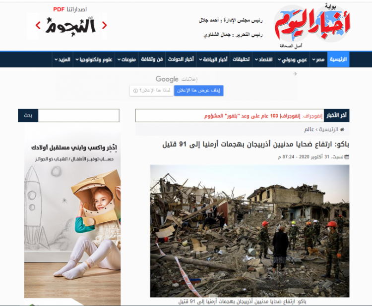 Misirin “Akhbarelyoum” və “Garbnews” informasiya portalları Ermənistan silahlı qüvvələrinin Azərbaycanın yaşayış məntəqələrinə raket hücumları, dinc əhalini və mülki obyektləri hədəf alması barədə xəbərlər yayıb.
