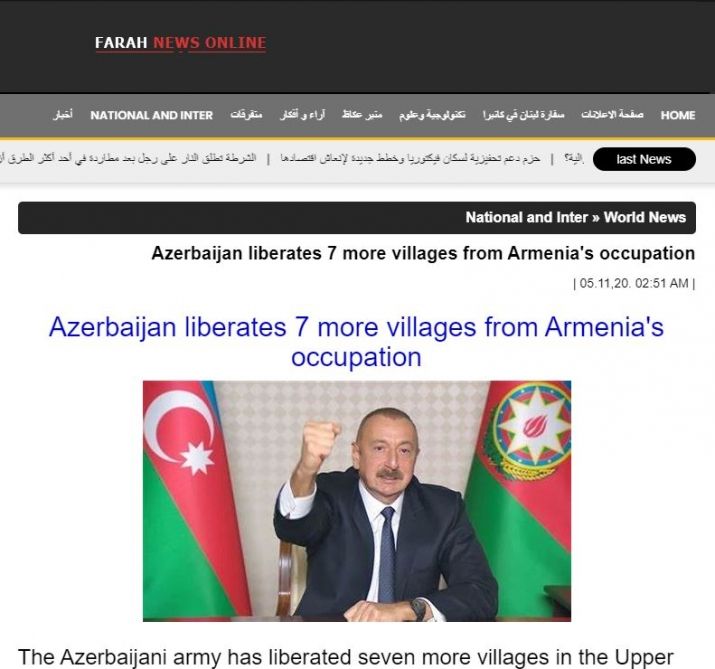 Avstraliyanın ingilis və ərəb dillərində yayımlanan “Farah news” saytı Azərbaycan Silahlı Qüvvələrinin daha yeddi kəndi işğaldan azad etməsi barədə məlumat yayıb.
