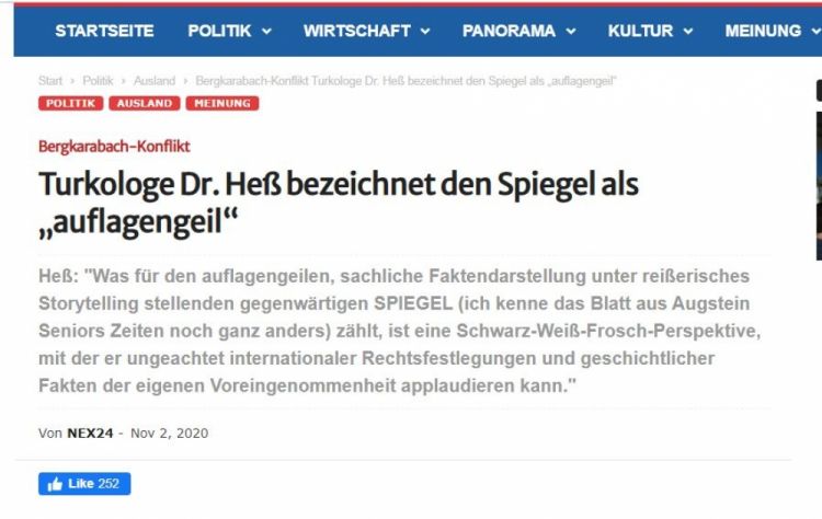 Alman türkoloq Mixael Raynhard Hesin “Spiegel” jurnalında ölkəmizlə bağlı dərc olunan qərəzli və qeyri-obyektiv məqalə ilə bağlı sözügedən nəşrin redaksiyasına ünvanladığı etiraz məktubunun xülasəsi dərc edilib (https://nex24.news/2020/11/turkologe-dr-hess-bezeichnet-den-spiegel-als-auflagengeil/).