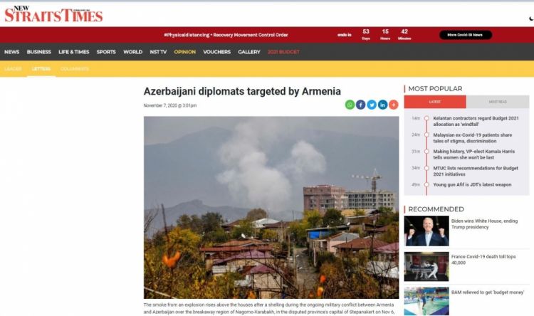 Malayziyanın ingilis dilində nəşr olunan nüfuzlu “New Straits Times” qəzeti Ermənistanın Azərbaycan diplomatlarını hədəfə alması barədə məqalə yayıb.