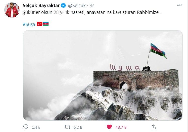 “Şükürlər olsun, 28 illik həsrəti ana Vətəninə qovuşduran Rəbbimizə”-, deyə yazan Selcuk Bayraktar Şuşanın qala divarlarına Azərbaycanın üçrəngli bayrağının taxıldığını əks etdirən foto da paylaşıb.