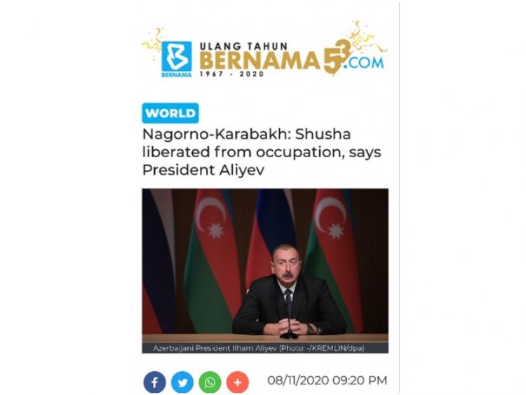 Malayziyanın BERNAMA Milli İnformasiya Agentliyi Azərbaycan Ordusunun keçirdiyi növbəti uğurlu əməliyyat nəticəsində Şuşa şəhərinin işğaldan azad olunması barədə məqalə yayıb.