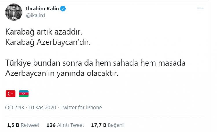 NUHÇIXAN İnformasiya Agentliyi xəbər verir ki, Türkiyə Prezidentinin sozçüsü İbrahim Kalın “Twitter” hesabından Azərbaycanın qələbəsini təbrik edib.