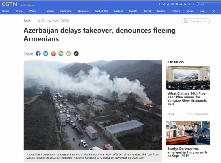 Çin Mərkəzi Televiziyasının ingilis dilində yayımlanan CGTN (China Global Television Network) kanalının internet səhifəsində ermənilərin Kəlbəcəri tərk edərkən törətdikləri vəhşiliklər barədə növbəti məqalə yerləşdirilib.