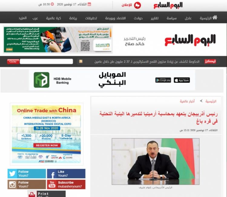 Misirin “Gomhuriyya” qəzetinin saytı “Azərbaycan Prezidenti Qarabağda infrastrukturu məhv edən Ermənistanın məsuliyyətə cəlb ediləcəyini bildirib” sərlövhəli xəbər yayıb.