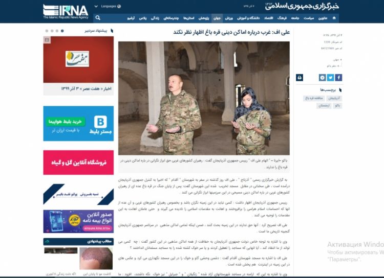 İranın İRNA rəsmi xəbər agentliyi Azərbaycan Respublikasının Prezidenti İlham Əliyev və birinci xanım Mehriban Əliyevanın işğaldan azad olunan Ağdam rayonuna səfəri barədə material dərc edib.