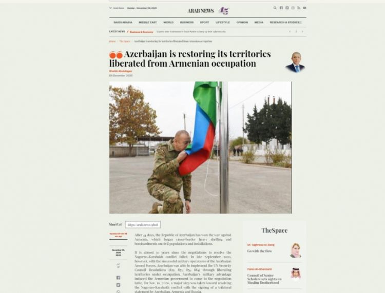 Səudiyyə Ərəbistanının ingiliscə nəşr olunan “Arabnews” qəzetində Azərbaycanın bu ölkədəki səfiri Şahin Abdullayevin “Azərbaycan işğaldan azad olunmuş ərazilərini bərpa edir” sərlövhəli geniş məqaləsi dərc edilib.