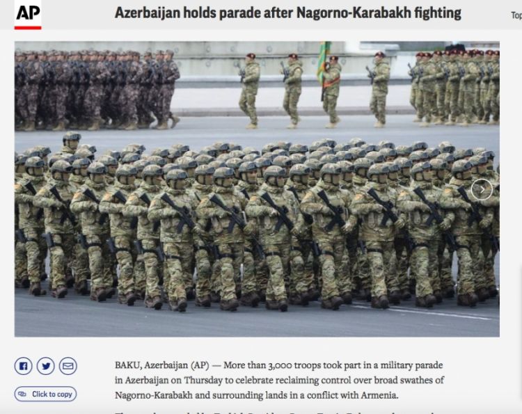 “Associated Press” agentliyinin saytında dərc olunan “Azərbaycanda Qarabağ müharibəsi başa çatandan sonra parad keçirilib” sərlövhəli məqalədə Bakıda dekabrın 10-da keçirilən Zəfər paradından bəhs edilir.