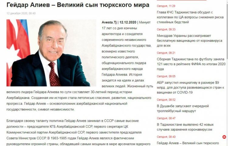 Tacikistanın “avesta.tj” portalında rus dilində “Heydər Əliyev:Türk dünyasının böyük oğlu” adlı məqalə dərc edilib.