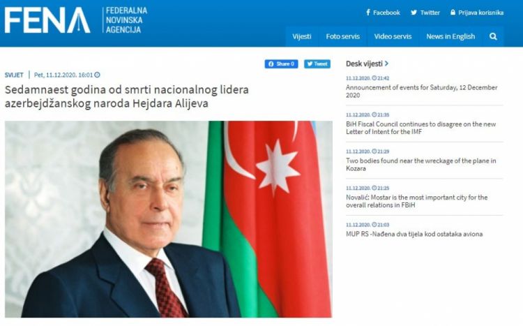 Bosniya və Herseqovinanın Federal Xəbərlər Agentliyi (FENA) “Azərbaycan xalqının ümummilli lideri Heydər Əliyevin vəfatından 17 il keçir” adlı məqalə yayıb.