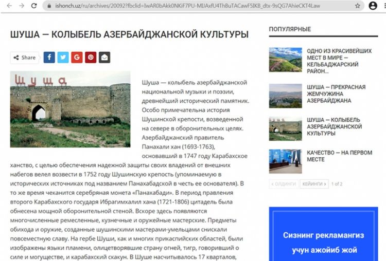 NUHÇIXAN İnformasiya Agentliyi xəbər verir ki, Özbəkistanın “ishonch.uz” portalı səhifəsində rus dilində “Şuşa Azərbaycan mədəniyyətinin beşiyidir” sərlövhəli məqalə yerləşdirib.