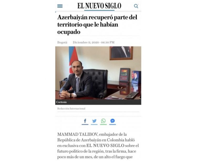 Kolumbiyanın nüfuzlu KİV-lərindən olan “El Nuevo Siglo” qəzetində Ermənistanın ölkəmizə qarşı təcavüzünün tarixi, son hərbi qarşıdurmalar, ordumuzun apardığı uğurlu əməliyyatlar və noyabrın 10-da imzalanmış atəşkəs bəyanatı haqda bu ölkədəki səfirimiz Məmməd Talıbovun müsahibəsi dərc olunub.