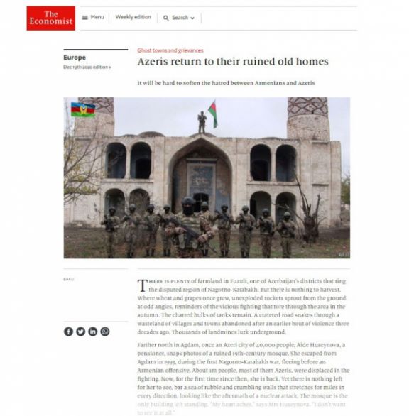 Böyük Britaniyanın “The Economist” jurnalında dərc olunmuş “Azərbaycanlılar özlərinin dağıdılmış evlərinə qayıdırlar” sərlövhəli məqalədə Ermənistan tərəfindən 30 ilə yaxın müddətdə işğal altında saxlanılan ərazilərdə dağıdılmış şəhər mərkəzləri, kəndlər, qəsəbələr barədə məlumat verilir. Həmin ərazilərin altı həftə davam edən müharibə nəticəsində Azərbaycan Silahlı Qüvvələri tərəfindən azad edildiyi diqqətə çatdırılır.