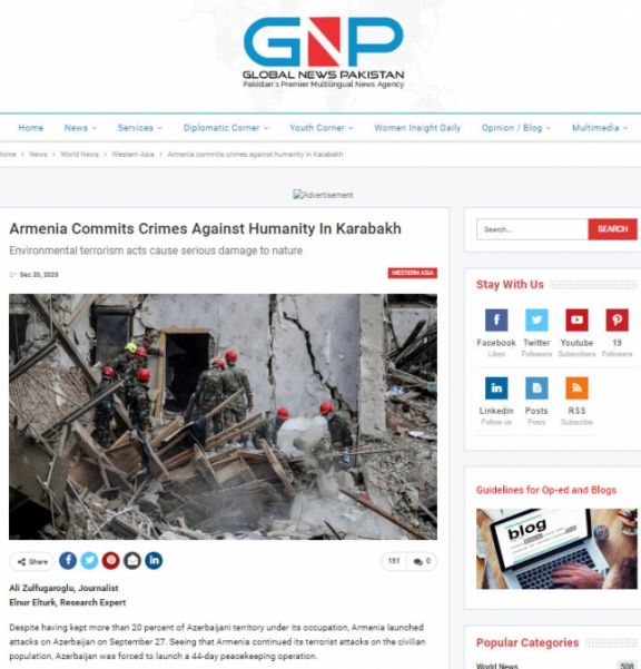 Pakistanın “globalnewspakistan.com” informasiya portalında Ermənistanın Qarabağda törətdiyi bəşəri cinayətlərlə bağlı məqalə dərc olunub.
