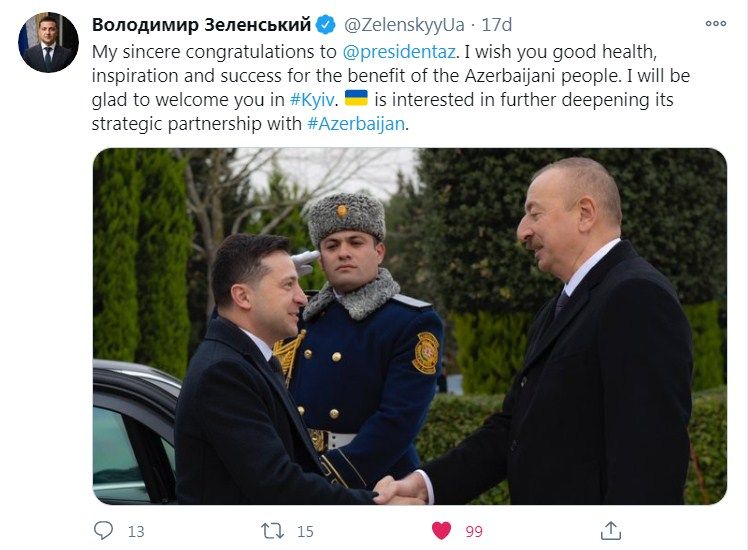 Ukrayna Prezidenti Vladimir Zelenski Azərbaycan Prezidenti İlham Əliyevin doğum günü münasibətilə paylaşım edib.
