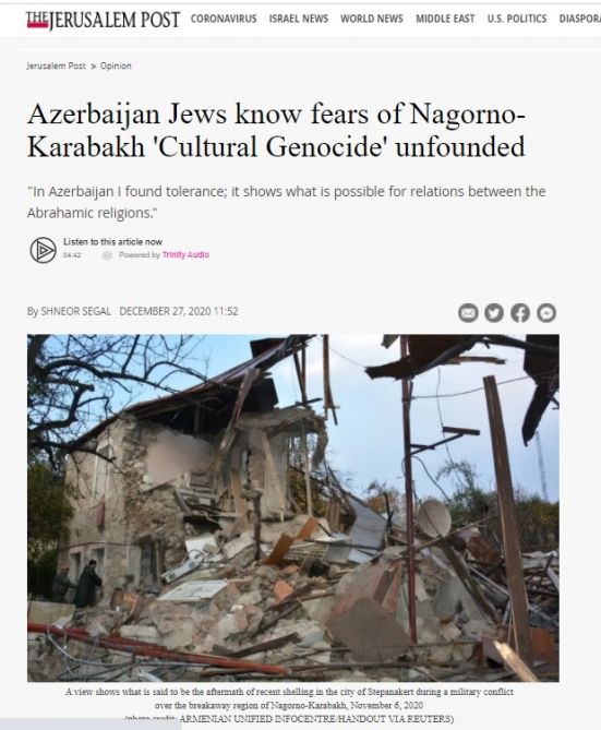 “The Jerusalem Post”: Azərbaycan yəhudiləri Dağlıq Qarabağda “mədəni soyqırımı” qorxusunu əsassız hesab edirlər