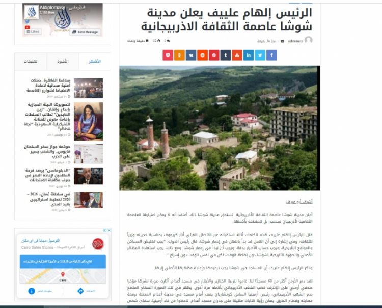 NUHÇIXAN İnformasiya Agentliyi xəbər verir ki, Misirin “Aldiplomasy” və “Əl Ğad” informasiya portallarında Şuşa şəhərinin Azərbaycan mədəniyyətinin paytaxtı elan olunması haqqında məqalə yayılıb.