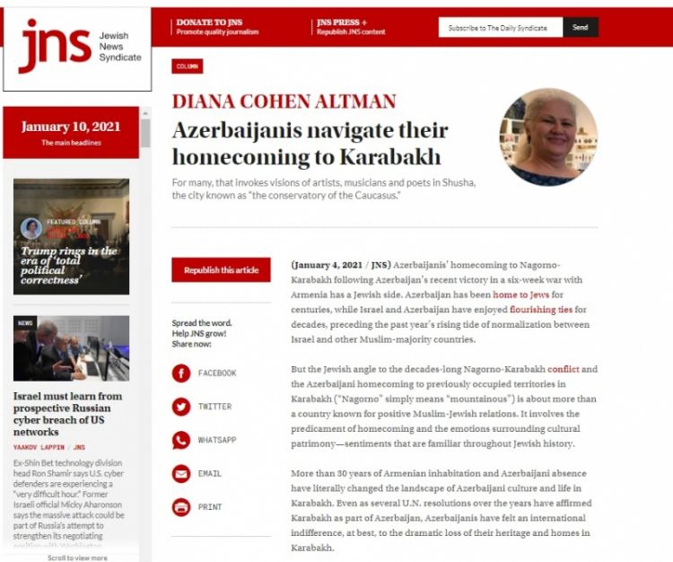 “Jewish News Syndicate” agentliyi Qələbədən sonra azərbaycanlıların Qarabağa qayıdışından bəhs edən məqalə yayıb