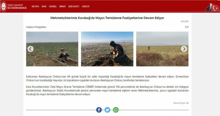 Türkiyənin Milli Müdafiə Nazirliyi: Hərbçilərimiz Qarabağda ərazilərin minalardan təmizlənməsində iştirak edir