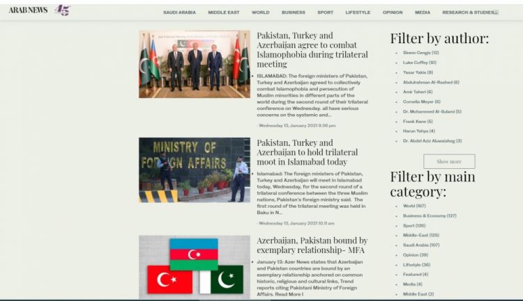 Səudiyyə Ərəbistanının ingilis dilində nəşr olunan “Arabnews” qəzetində Pakistan, Azərbaycan və Türkiyə xarici işlər nazirlərinin İslamabadda keçirdikləri üçtərəfli görüş, həmçinin İslamabad, Ankara və Bakı arasında strateji tərəfdaşlığın möhkəmlənməsi haqqında məqalələr dərc edilib.