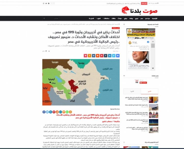 “Vətənpərvər” – Azərbaycanın Misirdə Diaspor Təşkilatları Birliyinin sədri, tədqiqatçı alim Seymur Nəsirovun “Azərbaycanda Yanvar hadisələri və Misirdə 1919 inqilabının oxşar cəhətləri” sərlövhəli məqaləsi Misir, Əlcəzair və Səudiyyə Ərəbistanı KİV-lərində yayılıb.