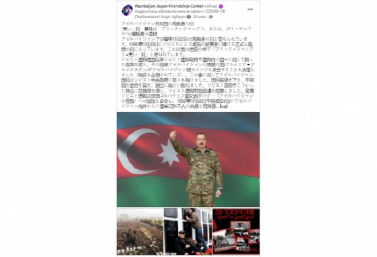 Yaponiyada fəaliyyət göstərən Azərbaycan-Yaponiya Dostluq Mərkəzi 20 Yanvar faciəsinin ildönümü ilə əlaqədar sosial şəbəkələrdə yapon dilində məlumatlar yayıb.