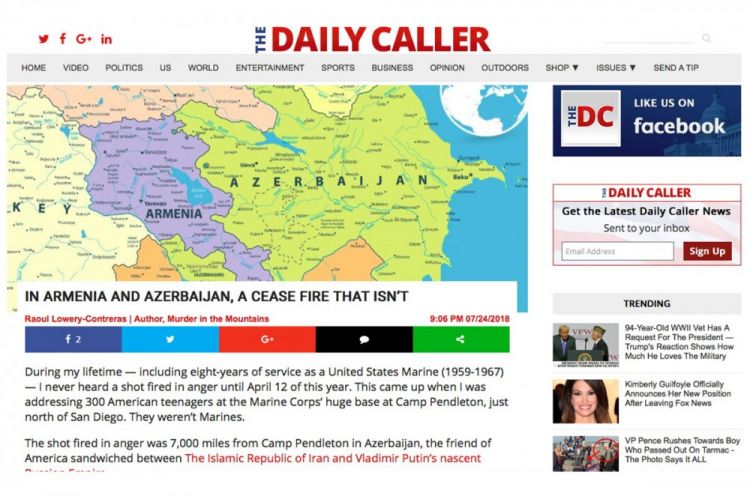 Amerikada çıxan “The Daily Caller” nəşrində siyasi icmalçı, “Dağlarda qətl: Xocalıda hərbi cinayət və Dağlıq Qarabağ münaqişəsi” kitabının müəllifi Raul Loueri Kontrerasın “Ermənistan və Azərbaycan: əslində mövcud olmayan atəşkəs rejimi” sərlövhəli məqaləsi dərc edilib.