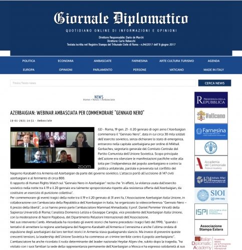 Dərc olunmuş yazılarda 20 Yanvar faciəsinin 31-ci ildönümü ilə əlaqədar Azərbaycanın İtaliyadakı səfirliyi tərəfindən videoformatda keçirilmiş anım tədbirinə dair məlumatlar da yer alıb. Həmin məlumatlarda aidiyyəti üzrə tədbirdə Azərbaycanın İtaliyadakı səfiri Məmməd Əhmədzadə, Roma Sapienza Universitetinin dosenti Daniel Pommier Vincelli, araşdırmaçı jurnalist Domeniko Letisiya, Azərbaycan İtaliya Birliyinin vitse-prezidenti Cuzeppe Kaniliyanın çıxış etdiyi qeyd olunub. Həmin anım tədbirində səfir Məmməd Əhmədzadənin 20 Yanvar faciəsinə səbəb olan hadisələr və bu faciənin acı nəticələri haqqında danışdığı, faciə ilə bağlı həqiqətlərin dünya ictimaiyyətinin diqqətinə çatdırılması və faciəyə layiqli siyasi-hüquqi qiymətin verilməsində ümummilli lider Heydər Əliyevin əvəzsiz xidmətləri haqqında məlumat verdiyi, 20 Yanvar faciəsinin Azərbaycanın milli kimliyinin formalaşmasına göstərdiyi həlledici təsirdən, dövlət müstəqilliyinin bərpa edilməsində dönüş nöqtəsi olmasından, məhz bu faciədən sonra milli azadlıq hərəkatının tam siyasi reallığa çevrilməsindən və Azərbaycan xalqının öz gələcəyini yalnız müstəqil Azərbaycanda görməsindən bəhs etdiyi bildirilib.