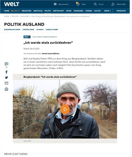 Almaniyanın “Die Welt” qəzetinin onlayın platforması olan “welt.de” portalında Klemens Hirmke və Daniel-Dilan Bömerin müəllifliyi ilə “Mən qürurla geri dönəcəyəm” başlıqlı videoreportaj yerləşdirilib.