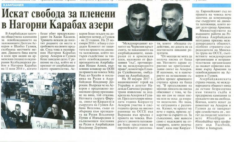 Ölkənin aparıcı “Standart” qəzetində “Dağlıq Qarabağda həbs olunmuş azərbaycanlılar üçün azadlıq tələb olunur’’ sərlövhəli xəbər dərc edilib. Xəbərdə 1993-cü ildə doğma torpaqlarının Ermənistan tərəfindən işğalı nəticəsində məcburi köçkünə çevrilmiş D.Əsgərov və Ş.Quliyevin 2014-cü ildə öz ata-baba yurdlarını ziyarət edərkən Ermənistan əsgərləri tərəfindən əsir götürüldükləri, digər Azərbaycan vətəndaşı Həsən Həsənovun isə öldürüldüyü qeyd olunur. 2016-cı ildə D.Əsgərov və Ş.Quliyevin hüquqlarını müdafiə komitəsinin yaradıldığı bildirilərək məsələ ilə bağlı BMT-nin insan hüquqları üzrə ali komissarına, Rusiya Prezidentinə və Rusiyanın Azərbaycandakı səfirinə müraciətlərin edildiyi vurğulanır. 2017-ci ildə Ukraynanın Milli Qəhrəmanı və deputat Nadejda Savçenkonun D.Əsgərov və Ş.Quliyevə dəstək bəyanatı yayması və beynəlxalq səviyyədə müdafiəsinə qoşulacağını bildirməsi barədə məlumat verilərək D.Əsgərovun oğlu Kürdoğlu Əsgərovun 2017-ci il sentyabrın 11-12-də Varşavada ATƏT-in insan haqları ilə bağlı sammitində iştirakına diqqət cəlb edilir. Yazıda girovların azad olunması istiqamətində Azərbaycan Xarici İşlər Nazirliyinin səylərinə də toxunulur, “Facebook” və “Twitter” sosial şəbəkələrində #freedilgam və #freeshahbaz həştəqlərindən istifadə olunmaqla D.Əsgərov və Ş.Quliyevə yardım göstərilə bilinəcəyi qeyd edilir. Sözügedən xəbər, həmçinin “Standart” qəzetinin rəsmi internet səhifəsində də yerləşdirilib.