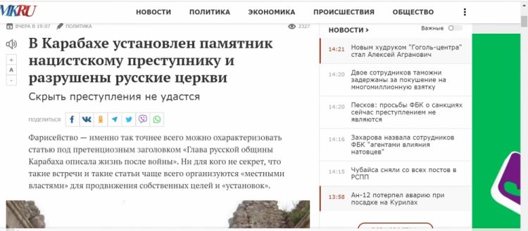 Komsomolskaya Pravda” qəzetində Azərbaycan Prezidenti Administrasiyasının Xarici KİV və QHT-lərlə iş sektorunun müdiri Fuad Axundovun “Qarabağda nasist caniyə heykəl qoyulub, rus kilsələri dağıdılıb. Cinayətləri gizlətmək mümkün olmayacaq” sərlövhəli məqaləsi dərc edilib.