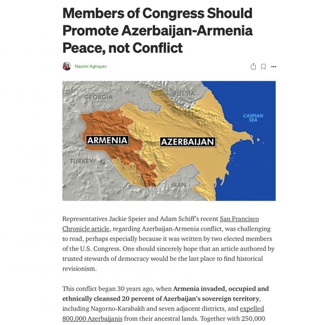Azərbaycanın Los-Ancelesdəki baş konsulu Nəsimi Ağayev ermənipərəst mövqeləri ilə seçilən ABŞ konqresmenləri Adam Şif (Adam Schiff) və Cəki Spierin (Jackie Speier) bu yaxınlarda dərc etdirdikləri, Azərbaycanı hədəf alan, saxta məlumatlarla dolu və qərəzli məqaləyə cavab verib. Baş konsulun cavab məqaləsi fevralın 11-də ABŞ-ın “Medium” portalında dərc olunub.