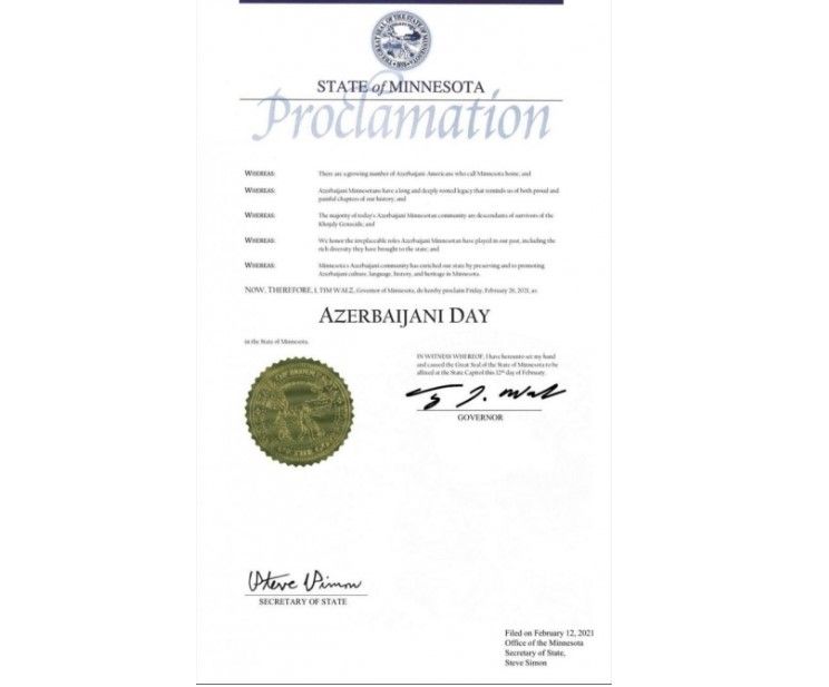 Minnesota ştatının qubernatoru Tim Volz fevralın 26-nın Azərbaycan günü elan edilməsi ilə bağlı bəyanat imzalayıb. Belə bir bəyanatın imzalanması Minnesota Azərbaycan Assosiasiyasının rəhbəri Günel Rallisin təşəbbüsü olub.