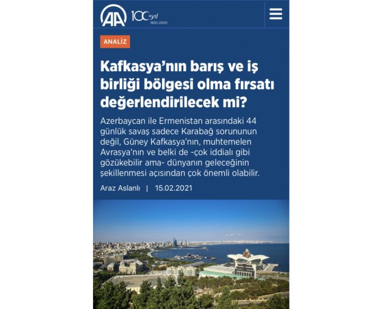 Türkiyənin Anadolu agentliyində Azərbaycanın 44 gün davam edən Vətən müharibəsinə həsr edilən “Qafqazın sülh və əməkdaşlıq bölgəsi olma fürsəti dəyərləndiriləcəkmi?” sərlövhəli analitik məqalə dərc olunub.