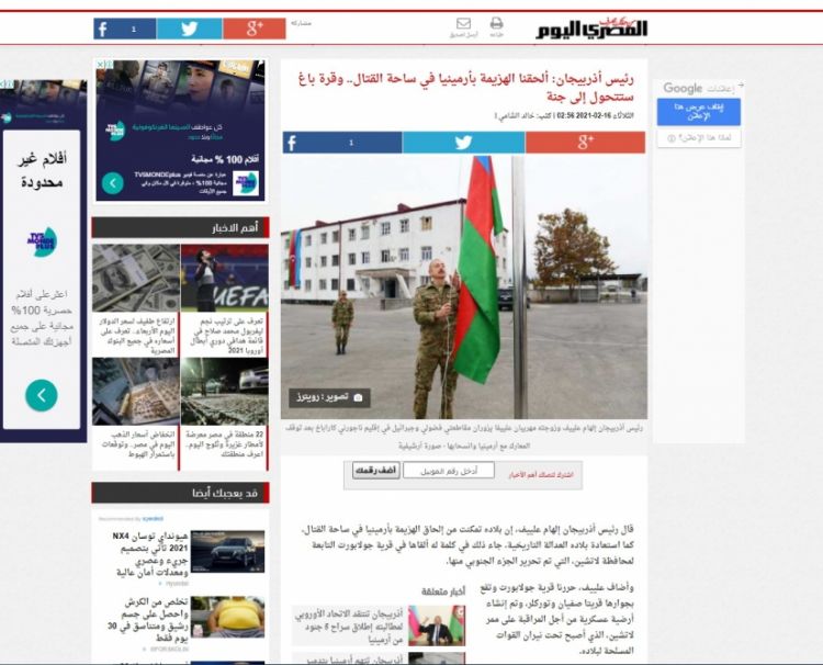 Misirin “Əl Masr Əl Yom” nəşrində Azərbaycan Prezidenti İlham Əliyevin işğaldan azad edilmiş Füzuli, Zəngilan, Laçın və Cəbrayıl rayonlarına səfərindən bəhs edən məqalə dərc olunub.