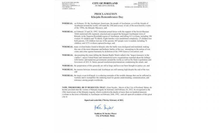 ABŞ-ın Men ştatının Portlənd şəhərinin meri Ketlin M.Snayder 2021-ci il fevralın 26-nın Xocalı qətliamı qurbanlarının anım günü kimi qeyd olunmasına dair bəyanat imzalayıb.