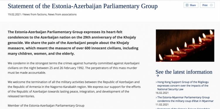 Estoniya parlamentinin - Riyqikoqunun Azərbaycan ilə parlamentlərarası əlaqələr üzrə dostluq qrupu Xocalı soyqırımının 29-cu ildönümü ilə bağlı bəyanat qəbul edib.