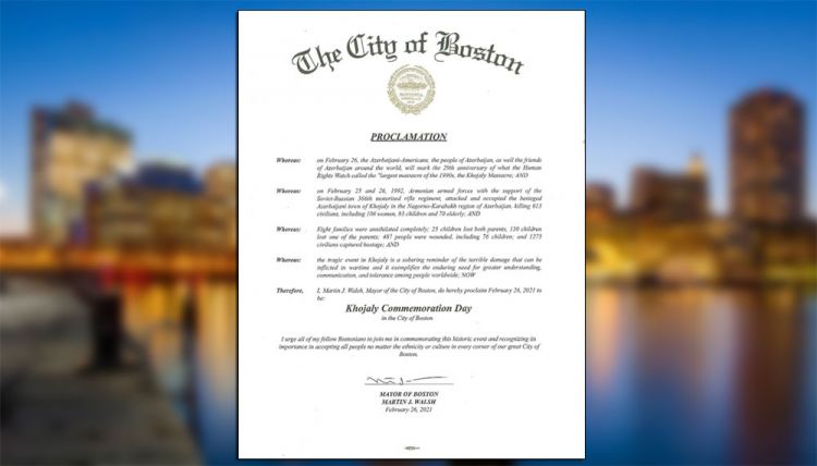 NUHÇIXAN İnformasiya Agentliyi xəbər verir ki, ABŞ-ın Massaçusets ştatının Boston şəhərinin meriyası Xocalı soyqırımının 29-cu ildönümü ilə əlaqədar proklamasiya dərc edib.
